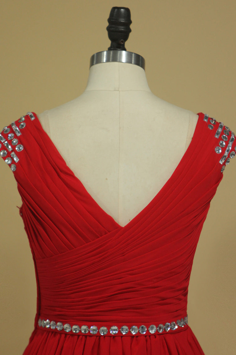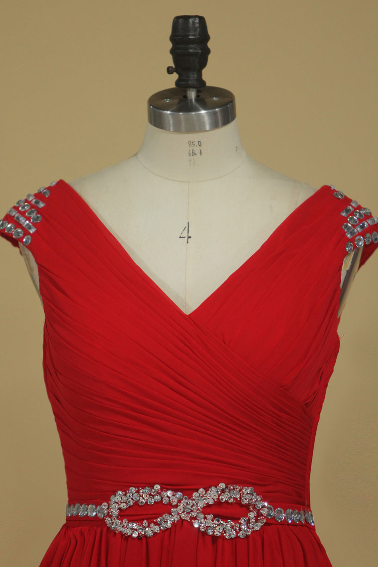 2022 A Line V Neck Chiffon Prom Dresses With Beads And Ruffles Floor Length