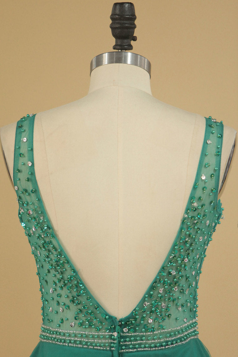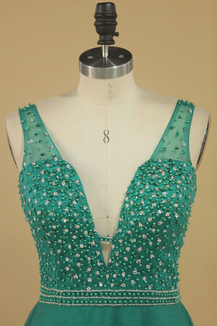 2022 A Line V Neck Prom Dresses Tulle With Beading Floor Length