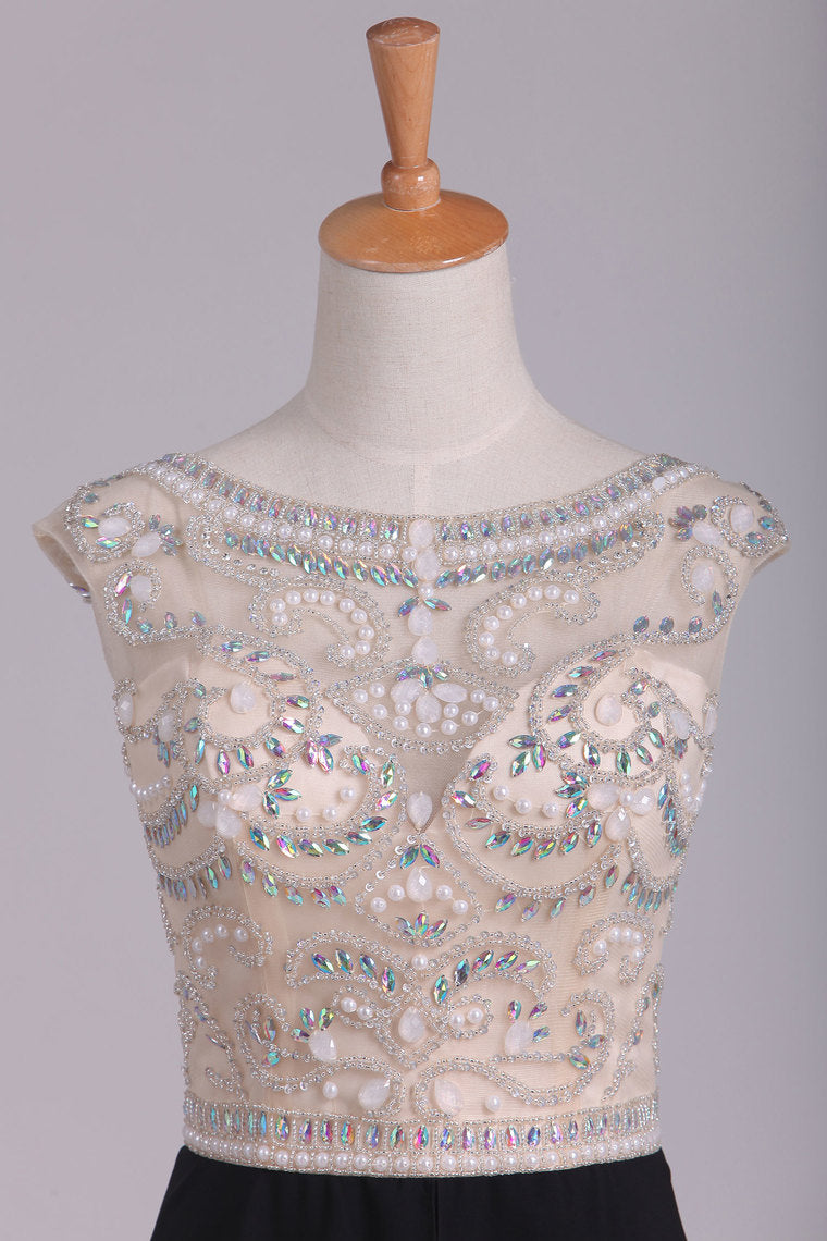 2022 Cap Sleeve Prom Dresses Bateau With Beading And Slit Chiffon