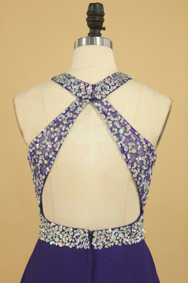2022 Halter Beaded Bodice Open Back Prom Dresses A Line Chiffon Sweep Train