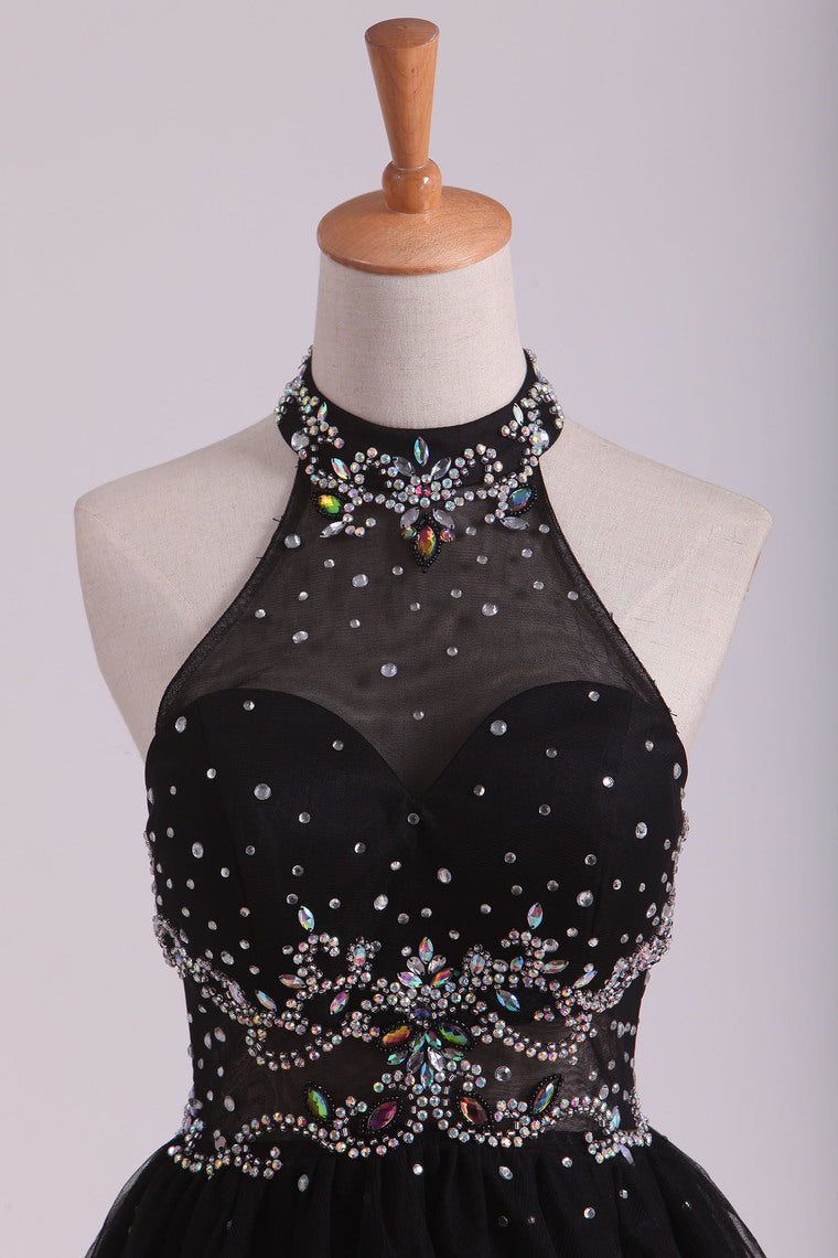 2022 High Neck A Line Open Back Tulle With Beads Homecoming Dresses