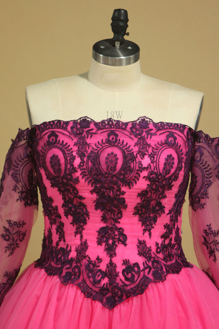 2022 Long Sleeves Boat Neck Prom Dresses A Line With Applique Tulle