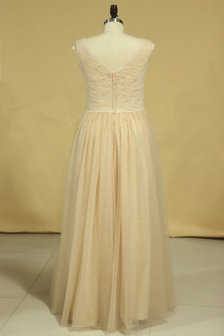 2022 Plus Size Bateau A Line Bridesmaid Dresses Floor-Length Lace & Tulle