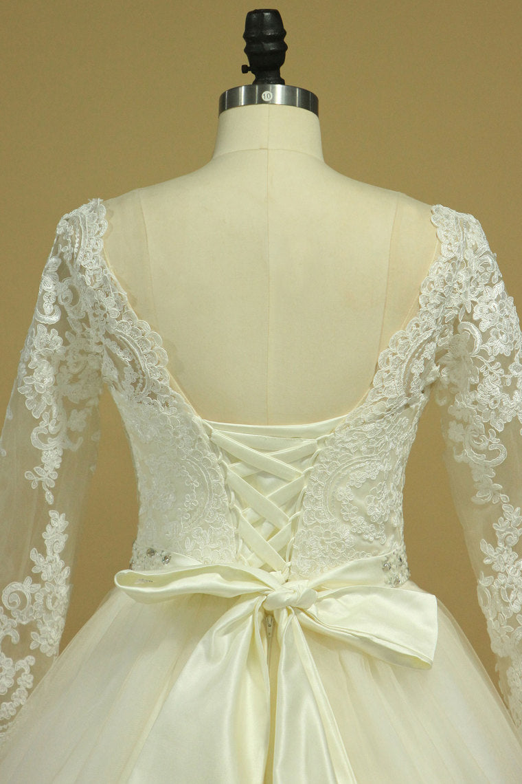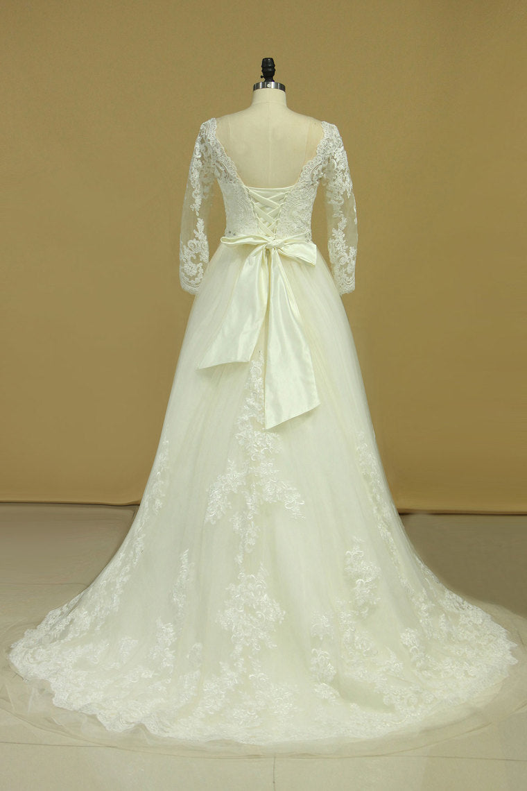2022 Plus Size Bateau Wedding Dresses 3/4 Length Sleeve With Applique Tulle