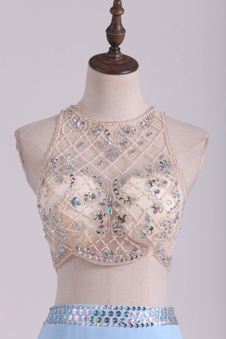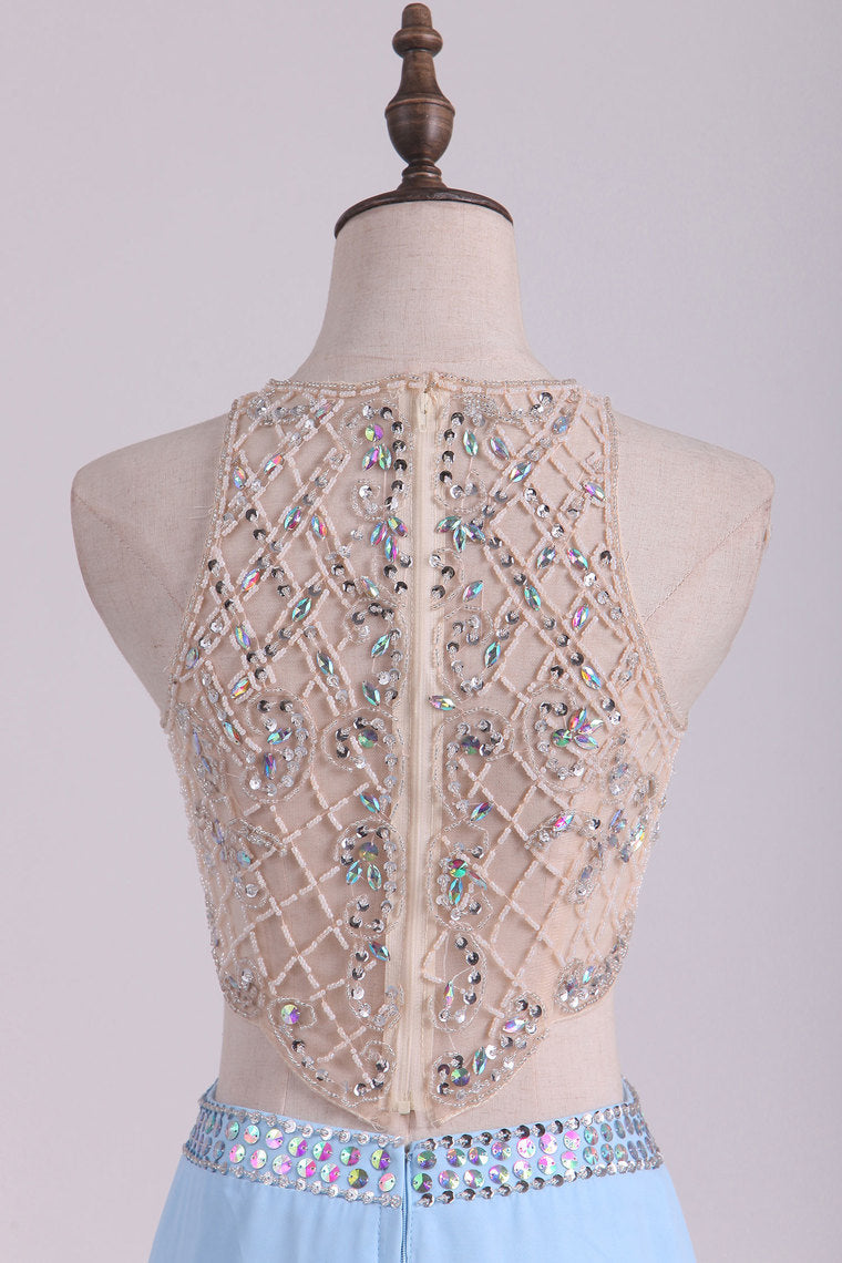 2022 Prom Dresses Scoop Sheath Two Pieces Chiffon With Beading And Slit Sweep Train