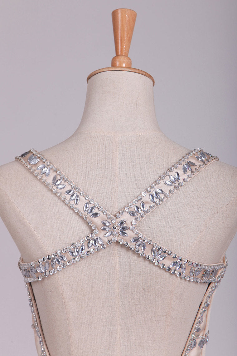 2022 Prom Dresses Spaghetti Straps Open Back Tulle With Beading Floor Length