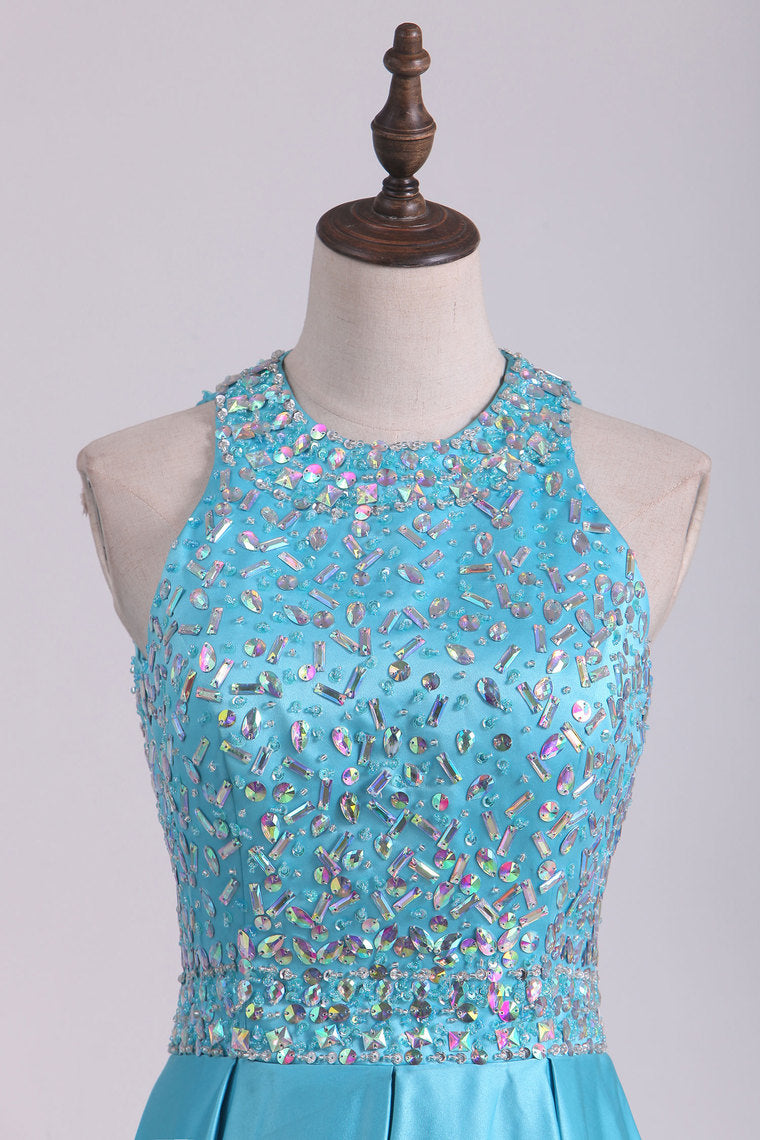 2022 Scoop Beaded Bodice Open Back A Line Satin Prom Dresses