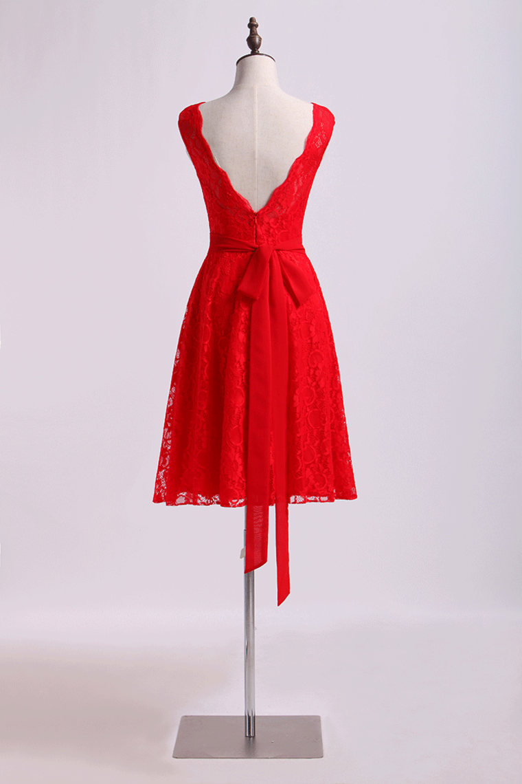2022 Scoop Bridesmaid Dresses A Line With Sash Knee Length Lace