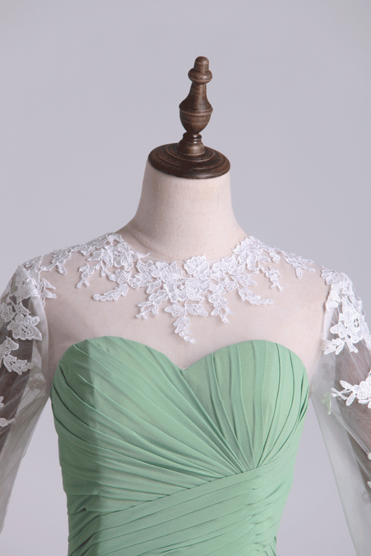 2022 Scoop Long Sleeves Column Prom Dresses With Applique & Ruffles Chiffon