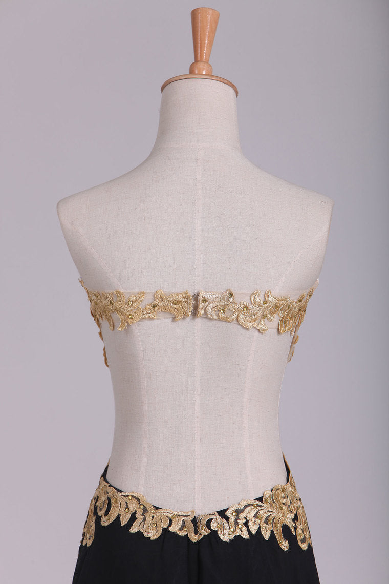 2022 Sweetheart Prom Dresses A Line Chiffon With Gold Applique Sweep Train