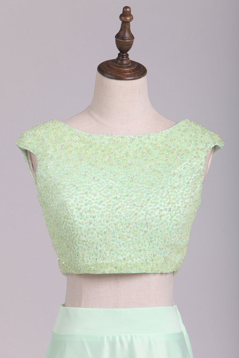 2022 Two Pieces Cap Sleeves A Line Prom Dresses Scoop Beaded Bodice Stretch Satin