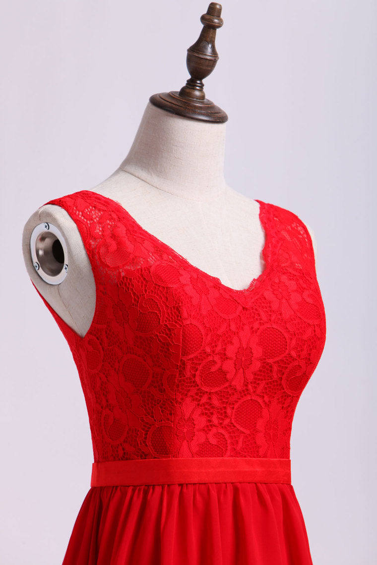 2022 V-Neck A Line Knee Length Lace & Chiffon Bridesmaid Dresses