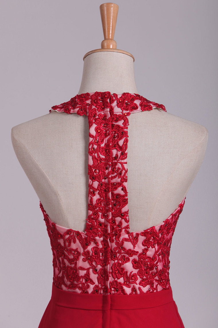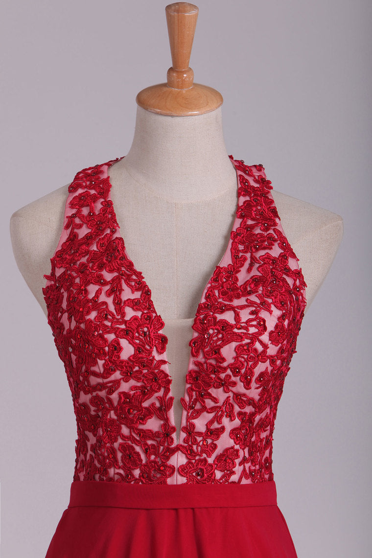 2022 V Neck Prom Dresses A Line Chiffon With Applique And Beads Open Back Floor Length
